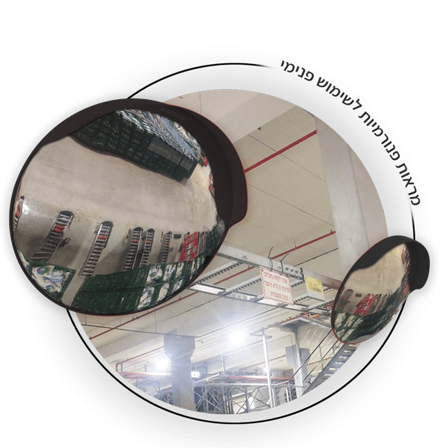 מראה פנורמית קוטר 60 ס”מ לשימוש פנים, הינה מוצר משלים לסדרת המראות הפנורמיות אותם חברתנו משווקת. הייחודיות העיקרית של מראה פנורמית זו, בהשוואה למראות האחרות, הינה בכך שצבעה שחור וכן, היא מתאימה לשימוש פנימי בלבד, ללא חשיפה לשמש. המראה מסופקת עם תושבת מתכווננת המתאימה להתקנה על גבי עמוד, או על גבי קיר באמצעות מתאם בעלות נוספת. השימוש הנפוץ ביותר במראות פנורמיות מסוג זה, הינו בתוך חנויות וסופרמרקטים, כאשר היתרון של המראה הוא בצבעה השחור, אשר “נטמע” טוב יותר בתוך חללי קניות, מבלי להפריע לעיצוב החלל.